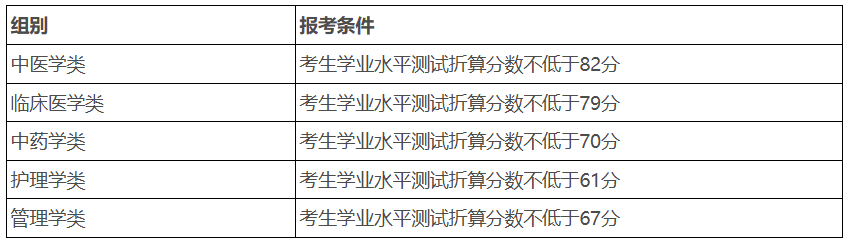 符合报考条件的考生按照学业水平测试成绩折算得分从高到低选拔产生入围面试名单,在考生学业水平测试成绩相同情况下,则按照考生学业水平测试单科成绩等第情况排序,其中中医学类、临床医学类、中药学类排序为:数学、语文、化学、生物学、外语、物理、思想政治、历史、地理、技术;护理学类专业排序为:语文、数学、外语、化学、生物学、历史、思想政治、地理、物理、技术;管理学类排序为:数学、语文、外语、化学、生物学、物理、思想政治、历史、地理、技术。