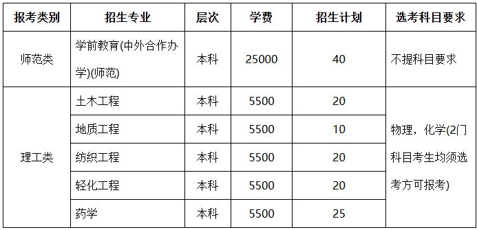 2.对考生身体健康要求,学校执行教育部《普通高等学校招生体检工作指导意见》的规定。特别提醒:为不影响毕业就业,建议体检色觉异常(色盲、色弱)者谨慎报考学前教育(中外合作办学)(师范)、轻化工程、药学等专业。