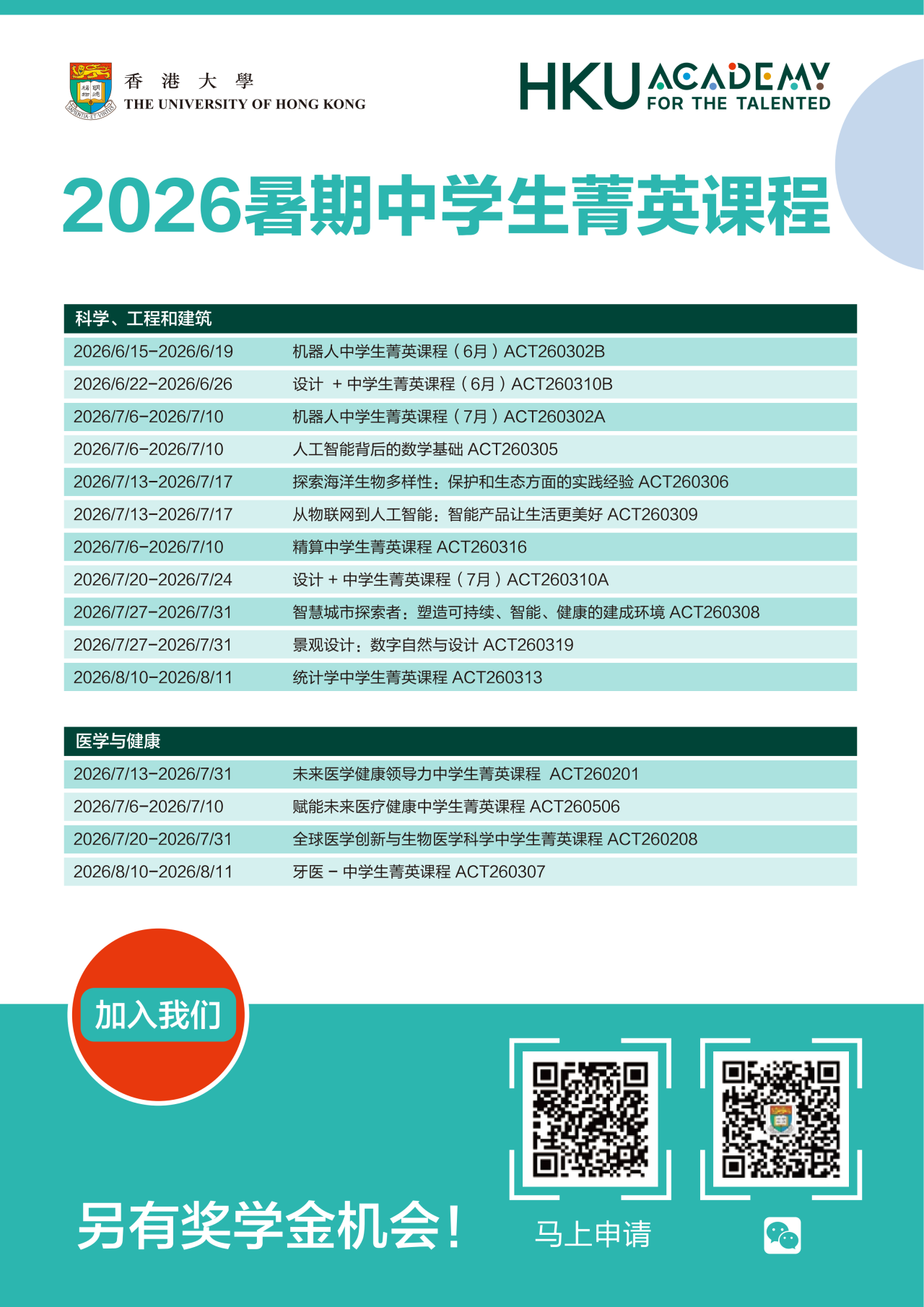 这个盛夏,香港大学2026年暑期中学生菁英课程邀你入局,六大热门领域全覆盖,港大教授与行业专家亲授,更有专属奖学金助力成长,开启你的暑期学术进阶之旅!报名即将在截止,快快申请加入吧~