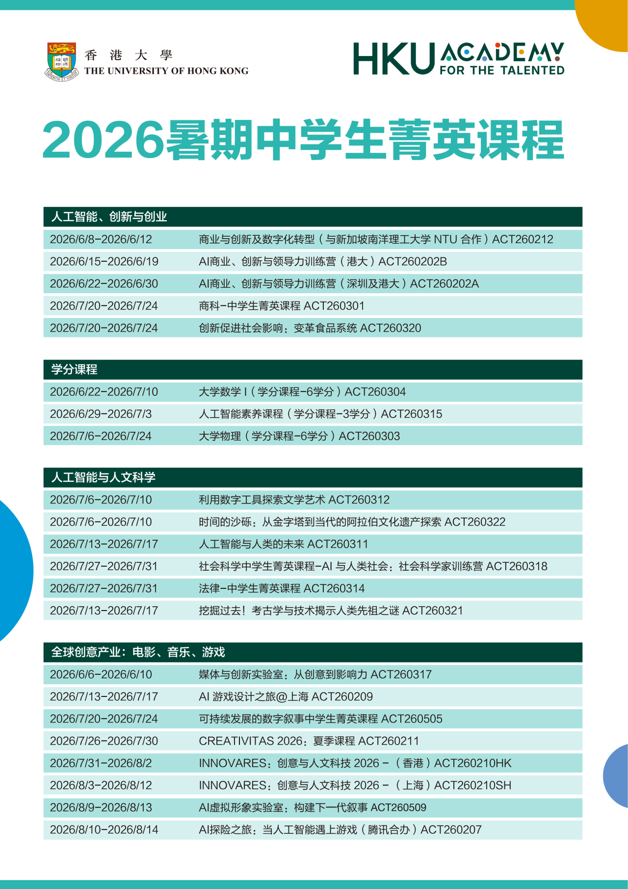 这个夏天,走进香港大学,接触顶尖学术资源,拓展国际视野,在6大热门领域中探索自我,在沉浸式课堂中收获成长。港大2026年暑期中学生菁英课程,期待怀揣梦想的你,赴一场盛夏的成长之约,开启一段有意义的学术之旅!立即报名,解锁你的港大暑期菁英体验!