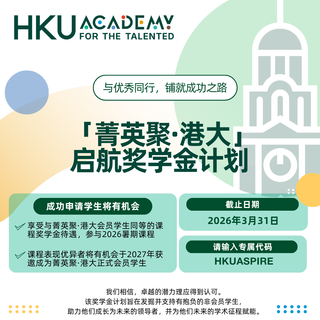启航奖学金:非会员参与课程,可在2026年3月31日前提交奖学金申请,在申请时输入奖学金代码HKUASPIRE有机会获得课程奖学金,并根据学生课堂表现,结课后受邀成为2027年「菁英聚‧港大」会员。