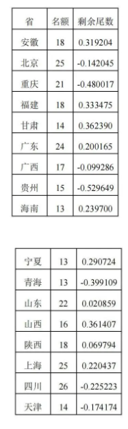 各类计算后的名额取整,正负尾数转入次年。根据以上分配办法核定的各赛区参加决赛的人数和转入下一年的尾数如下: