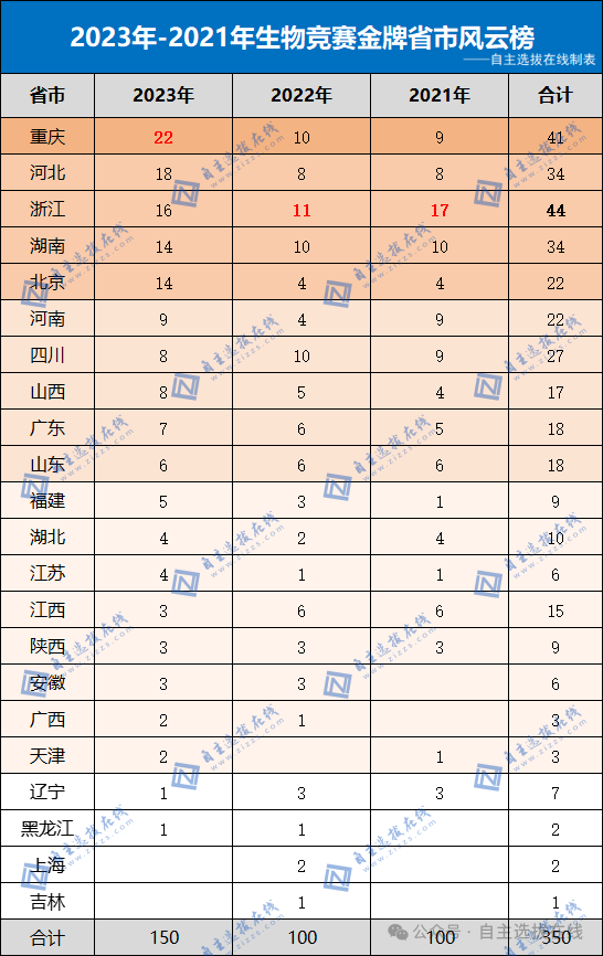 2024年生物竞赛决赛考试于8月17日开考,将于20日举办闭幕式,届时也会公布获奖名单,为方便大家近三年各省市获奖情况,自主选拔在线团队整理了2021-2023年生物竞赛金牌省市榜,供大家查看!
