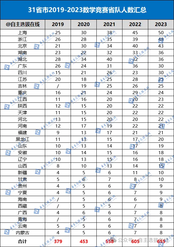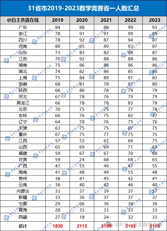 那么,今年又会产生多少省一奖项和省队成员?今年哪所中学省一最多?自主选拔在线整理了数学竞赛31省市2019-2023年省一&省队的详细名额以及各中学省一人数排行榜!用数据说话,下面一起来看吧!
