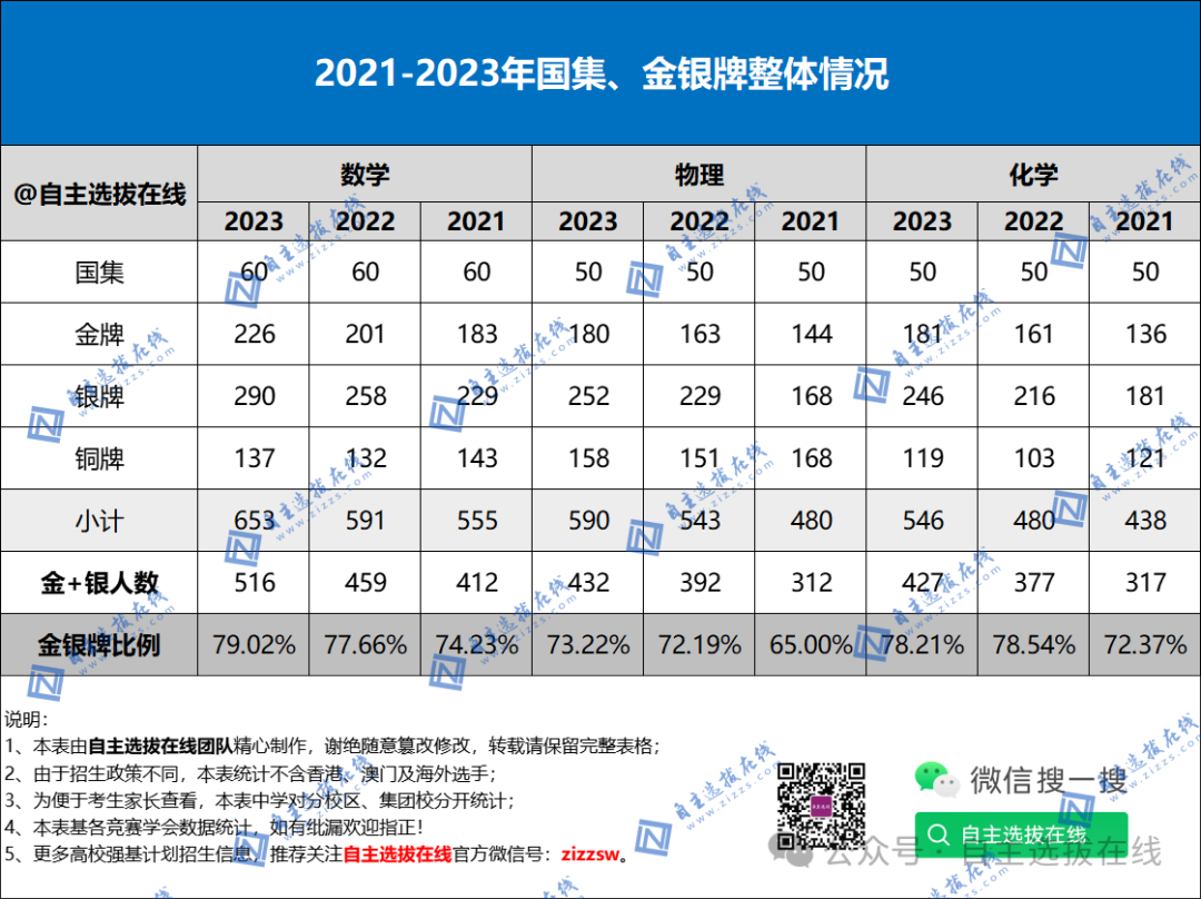 随着2024年数学、物理、化学竞赛决赛的临近,各省中学的获奖情况成为了衡量拔尖人才培养实力的重要指标。这些竞赛不仅是对学生学术能力的考验,也直接影响着学生的初高择校及升学规划。尤其是金牌、银牌奖项,它们对应着强基计划中的破格资格,为学生提供了更多的升学机会。今天,自主选拔在线团队整理了2021-2023年数物化学科竞赛国集、金银牌总体情况,供大家参考!