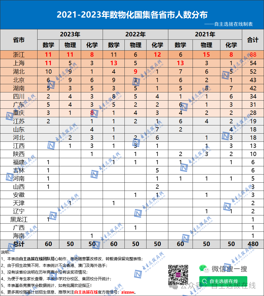 在数物化学科拔尖人才培养上,浙江省一骑绝尘,在2021-2023年数物化三大学科竞赛中合计88人次入选国家集训队,排名第一,比排在第二名的上海市,足足多了34人次,这三年共计6次分别在数学、物理、化学单科竞赛中获得国集人数最多!