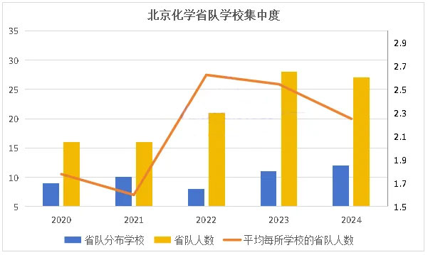 北京市化学省队的学校分布集中度近年来波动明显,尽管每所学校的省队成员数量普遍维持在3人以下,但学校间的分布情况却经历了显著变化。2022年,北京化学省队仅分布在8所学校,达到了近五年来的最高集中度。此后,集中度逐渐下降,省队成员所在学校的数量持续增加,表明越来越多的学校具备了培养省队选手的能力。