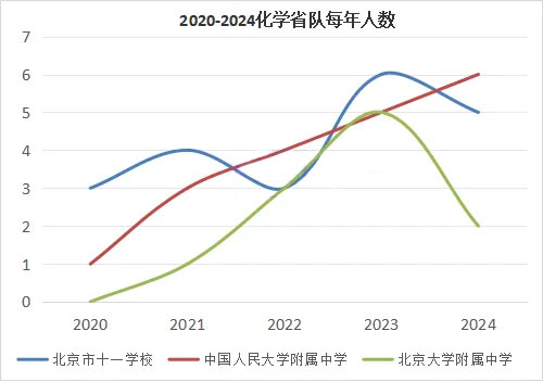 在北京市的化学竞赛领域,各校之间的竞争尤为激烈,彼此间的差距较小。近五年来,除了北京大学附属中学外,其他学校的化学省队成员总人数普遍维持在10人以下,展现了北京市化学教育的均衡发展和高水平竞争。