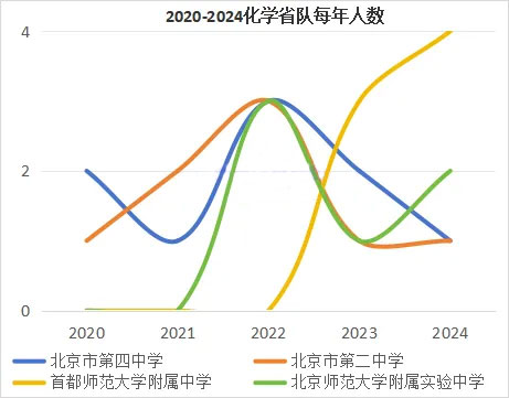 与此同时,首都师范大学附属中学和北京师范大学附属实验中学正逐渐成为该领域的新星。其中,北京师范大学附属实验中学已连续四年培养出化学省队成员,实力日趋稳定。而首都师范大学附属中学虽然近五年内仅于2023年和2024年培养出省队成员,但其展现出的潜力十分突出。尤为值得一提的是,在2024年,首都师范大学附属中学有4名学子入选省队,位列北京第三,充分证明了其在化学竞赛领域的快速崛起和强大潜力。
