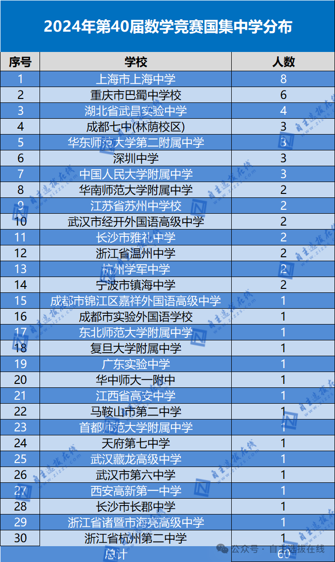 随着2024年第40届数学竞赛决赛的圆满落幕,获奖名单已经正式公布。今年,共有60位才华横溢的学生脱颖而出,成功入选国家集训队,他们分别来自全国30所顶尖中学。为了使大家能够更便捷、更深入地了解这些优秀学生背后的学校分布情况,自主选拔在线团队特别整理了2024年第40届数学竞赛决赛国家集训队的中学分布数据,供各位参考和查阅。