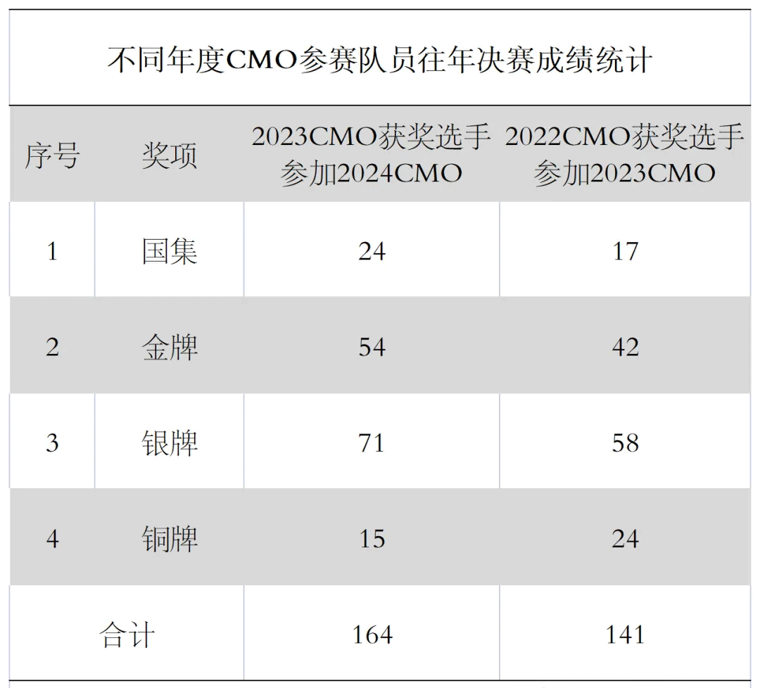 据统计,近两年中,上一届国家集训队成员继续参加下一届CMO的人数,2023年为17人,2024年为24人。具体数据详见下表。