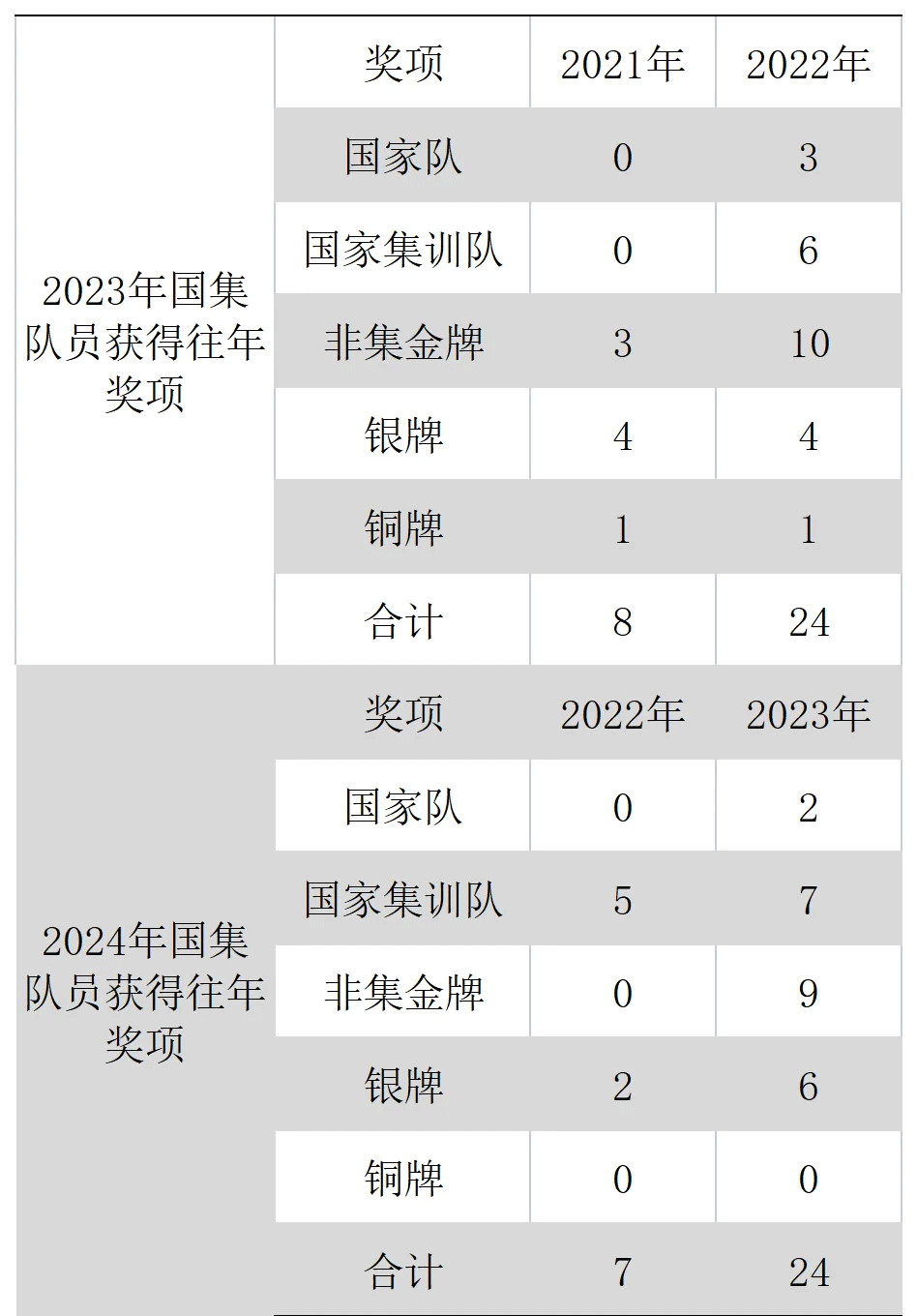 根据最终获奖数据,新一届国家集训队中连续获得国家集训队及以上奖项的选手,2023年和2024年均为9人。其中,2023年国家集训队包含3名前一年度国家队队员,2024年国家集训队包含2名前一年度国家队队员。其他获奖情况详见表格。