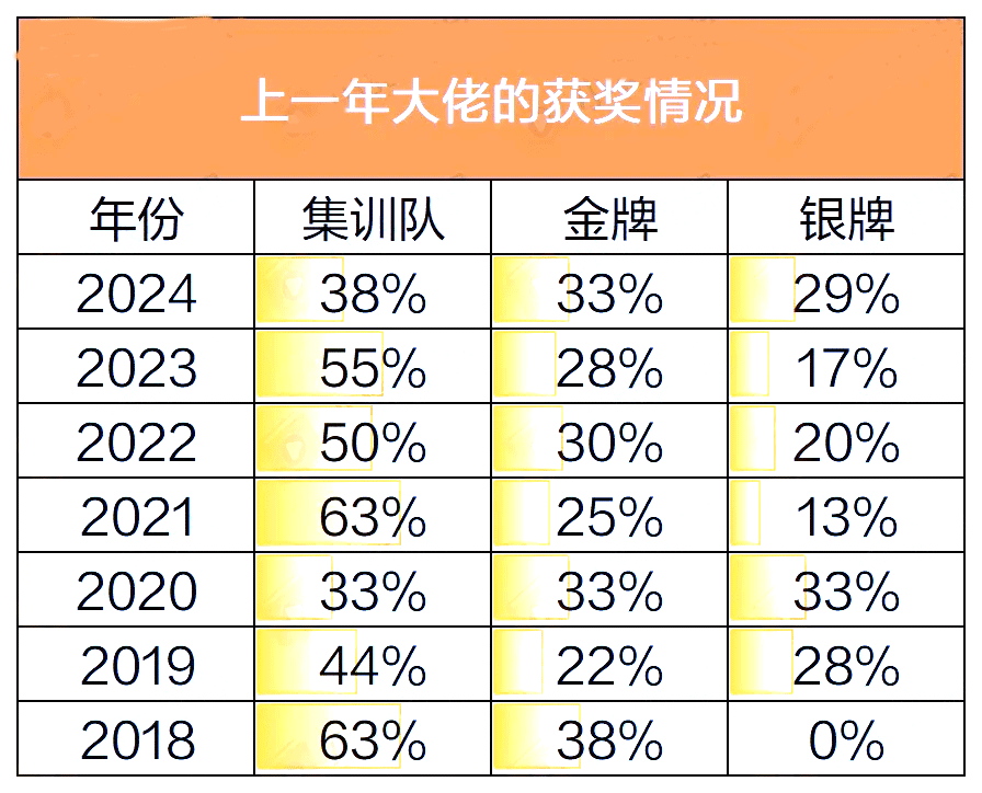 在过去六年中,上一年的大佬中能够连续入选集训队的选手占比不超过62.5%,其中比例最低的2020年中,最终“大佬们”的获奖情况则是国集、金牌、银牌平分秋色,各自占比33%。