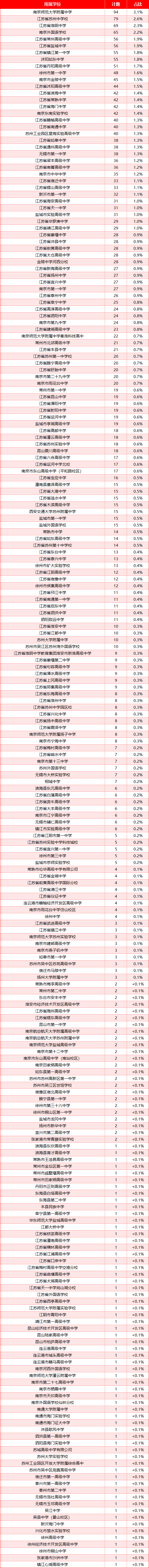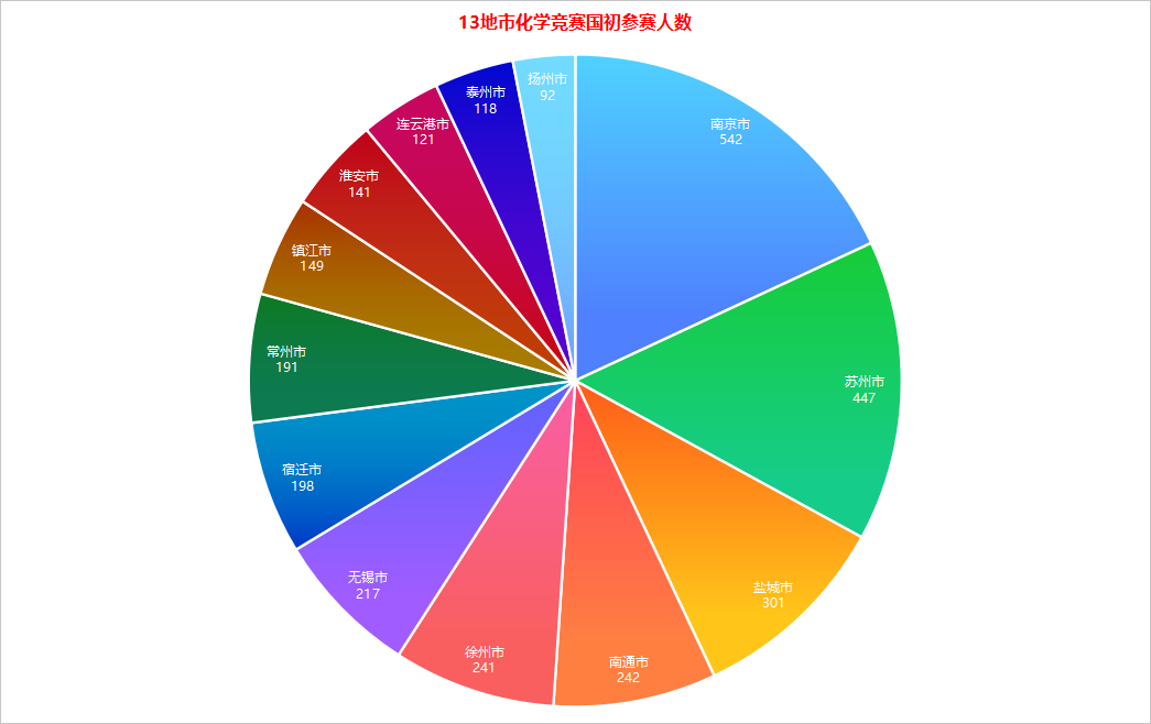 南京市542人参加化学竞赛江苏赛区决赛,参赛人数最多;苏州市紧随其后,447人参赛;盐城市301人参赛;整体来看参赛人数,苏南苏北基本各占半壁!