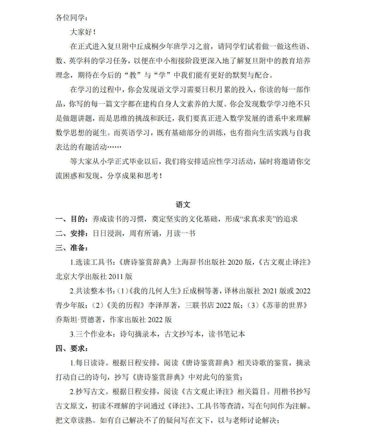 2025年复旦附中丘成桐少年班新生学习单