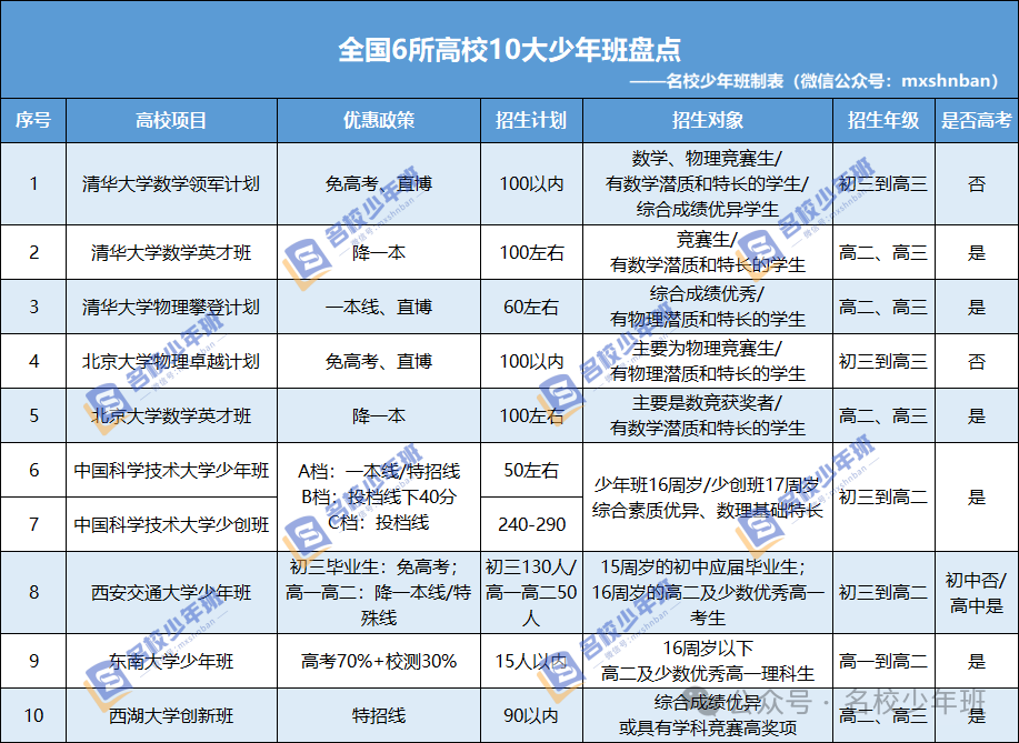 少年班招生是面向低年级考生特有的一种招生方式,主要目的是培养在科学技术等领域出类拔萃的优秀人物。少年班对考生年龄和年级有明确要求,通常面向15-16岁以下的少年。拥有无须高考、一考免三考、直降一本线等优惠政策,以吸引和选拔具有超常潜力的学生。现有清华大学、北京大学、中国科学技术大学、西安交通大学、东南大学、西湖大学六所高校的十个少年班招生项目。