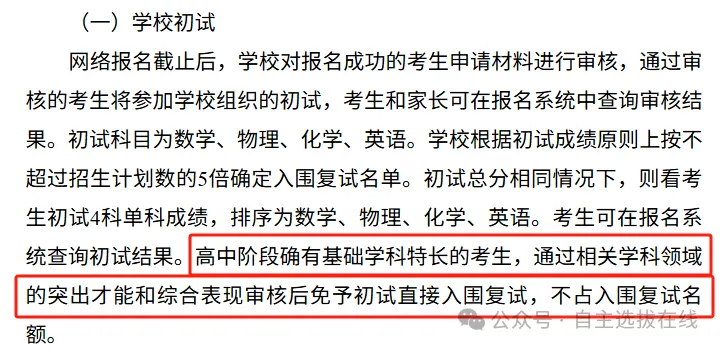 2025年西湖大学创新班明确:高中阶段有基础学科特长的考生,通过审核后可免初试直接入围复试,且不占用复试名额。