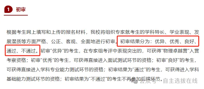 2️⃣在清华物理攀登计划、北大物理卓越计划、清华北大数学英才班等少年班中。在初审环节会将初审结果进行评级:获得“优秀”评级的人可直接进入面试环节或获得入围认定(具体情况要看每个少年班具体的要求)
