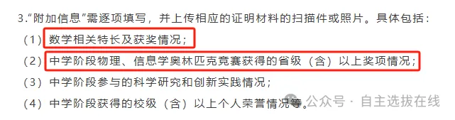 3️⃣清华大学数学领军计划、数学英才班等申请办法中明确:附加信息需逐项填写,并上传相应证明材料,具体材料有相关学科特长以及竞赛奖项等。
