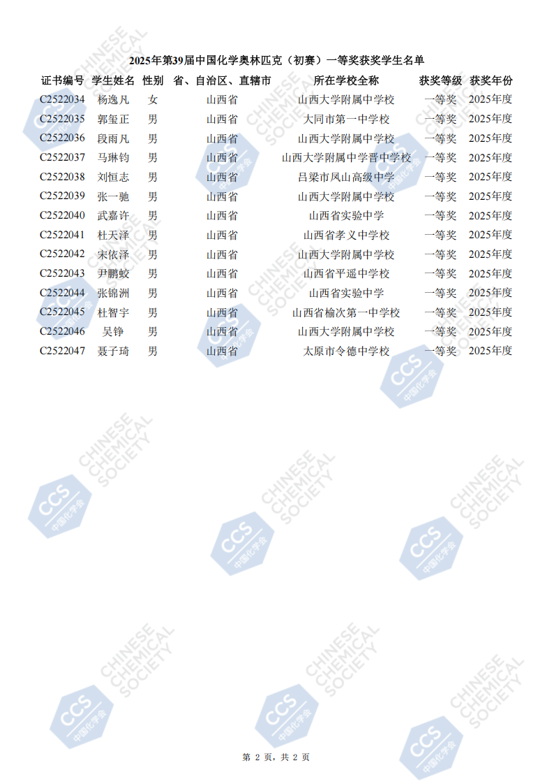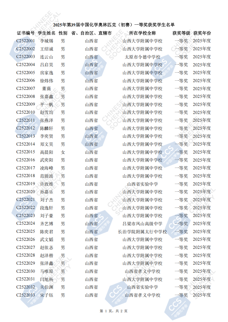 山西省2025年中学生化学竞赛初赛省一等奖获奖名单