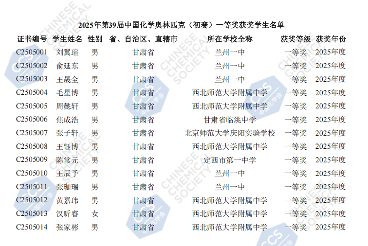 2025甘肃中学生化学初赛一等奖获奖名单详情公布,本次省一获奖同学来自哪些中学?自主选拔在线团队整理福建省2025年全国中学生化学竞赛初赛省一获奖名单详细内容,一起来看!