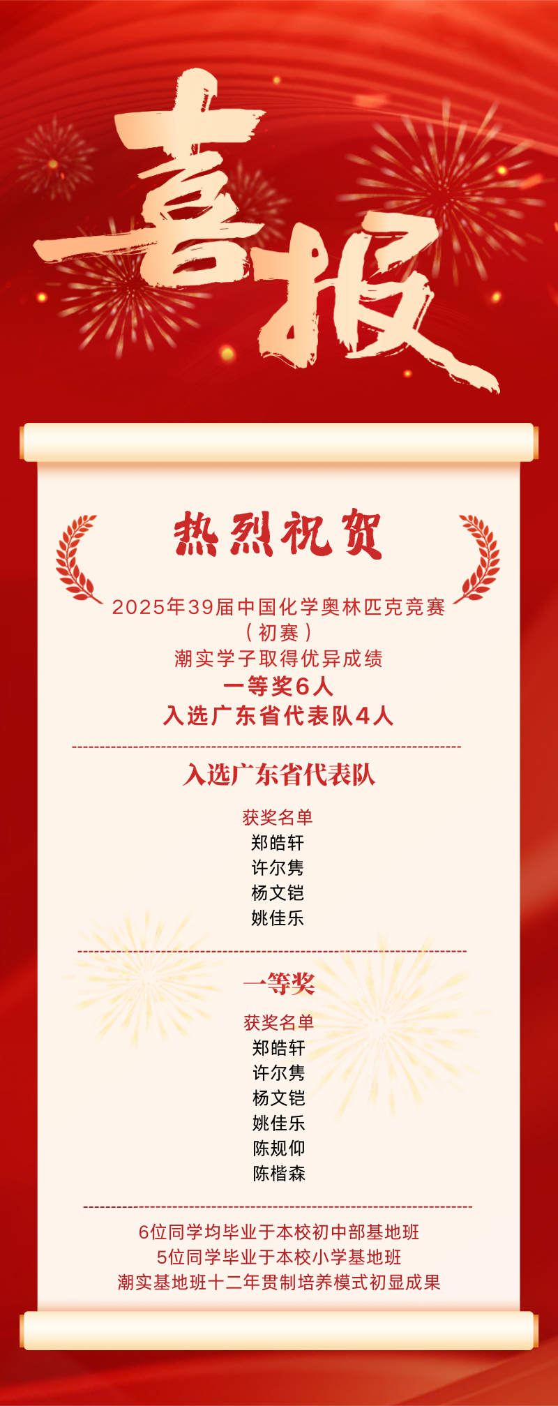 2025年39届中国化学奥林匹克竞赛(初赛)潮实学子取得优异成绩,一等奖6人,入选广东省代表队4人。自主选拔在线团队整理汕头市潮阳实验学校化学竞赛相关内容,一起来看!