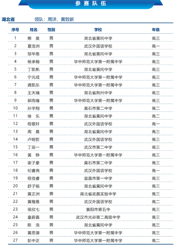 湖北省2025年第42届全国中学生物理竞赛复赛省队获奖名单