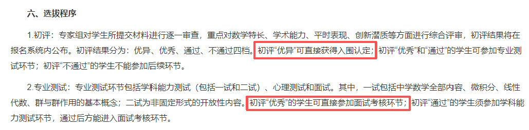往年的招生简章中初评结果分为:"优异"、"优秀"、"通过”和“不通过”四档。四档评级对应的测试环节也不一样。"优异"考生可直接入围;"优秀"考生可免一试和二试,直通面试。而今年的招生简章中只有“通过”与“不通过”两档评级,同时后面还提到“在数学、物理、信息学等方面有突出表现的同学可申请免于参加数学基础测试、学科能力测试。也就是说所有考生至少都要参加面试环节,才能入围,至多经历数学基础测试、学科能力测试(一试和二试)、面试方可入围。这实际上是对顶尖学科竞赛特长生的特殊优惠!类似于25年初审评级的“优秀+优异”评级!可借鉴!