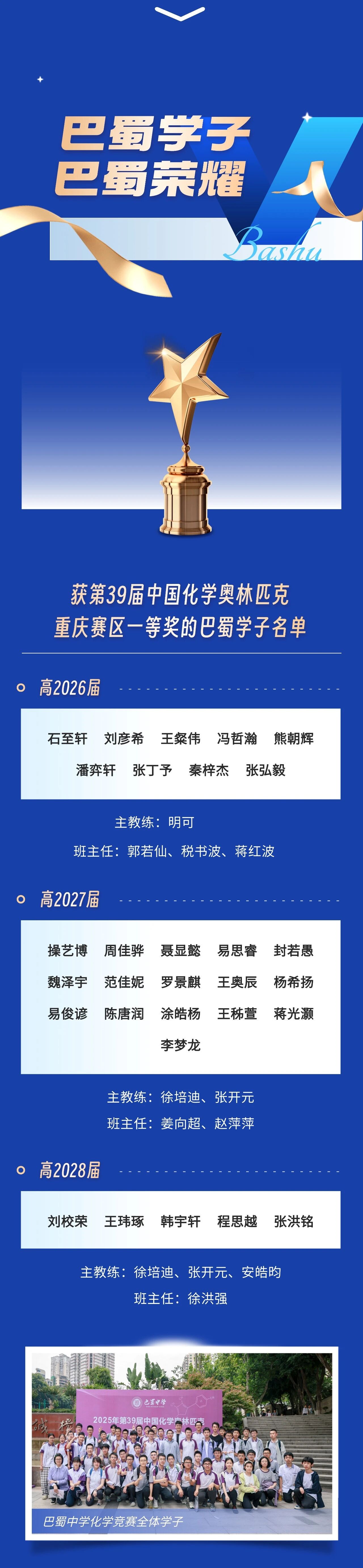 省一、省队人数双双领跑重庆!巴蜀中学30人获2025年化学竞赛省一
