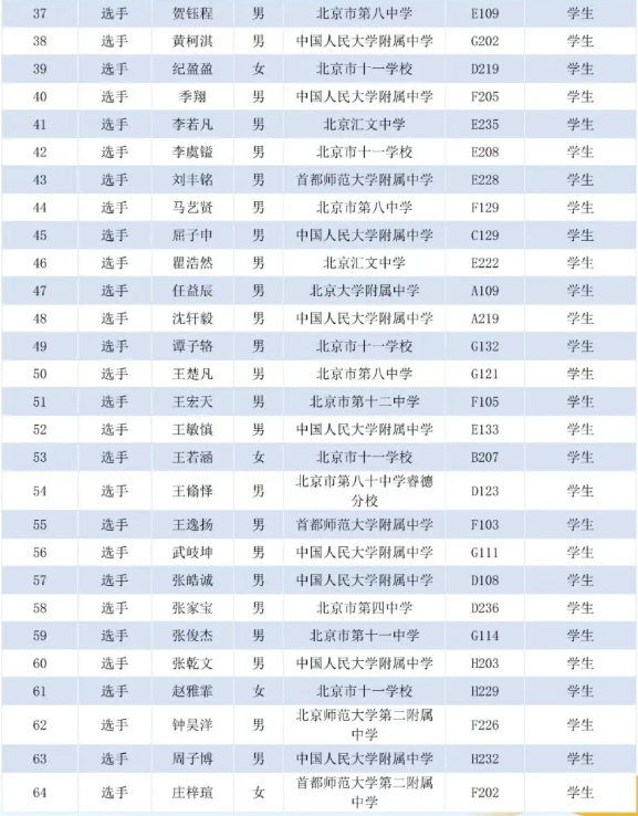 第39届中国化学奥林匹克决赛北京市代表队选手名单