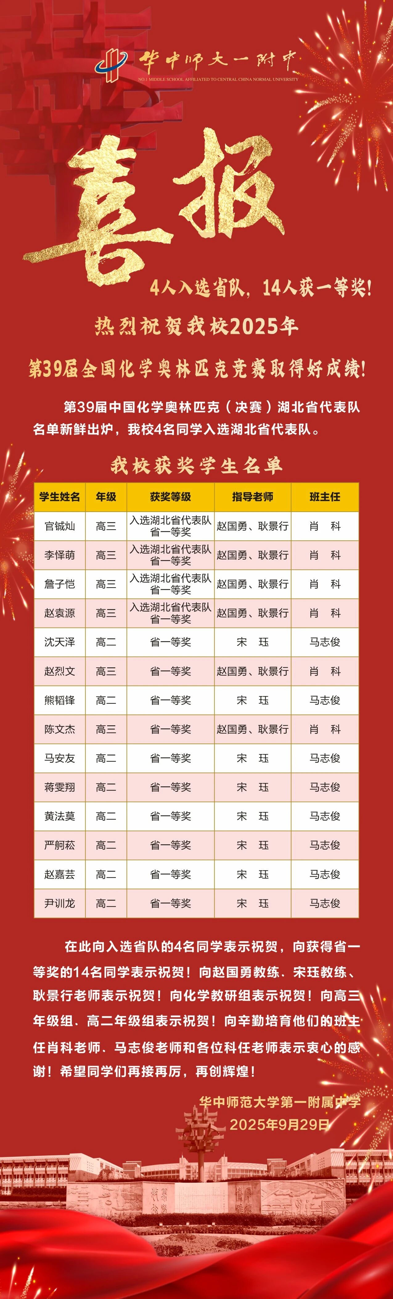 热烈祝贺华中师范大学第一附属中学在2025年第39届全国化学奥林匹克竞赛中取得优异成绩!