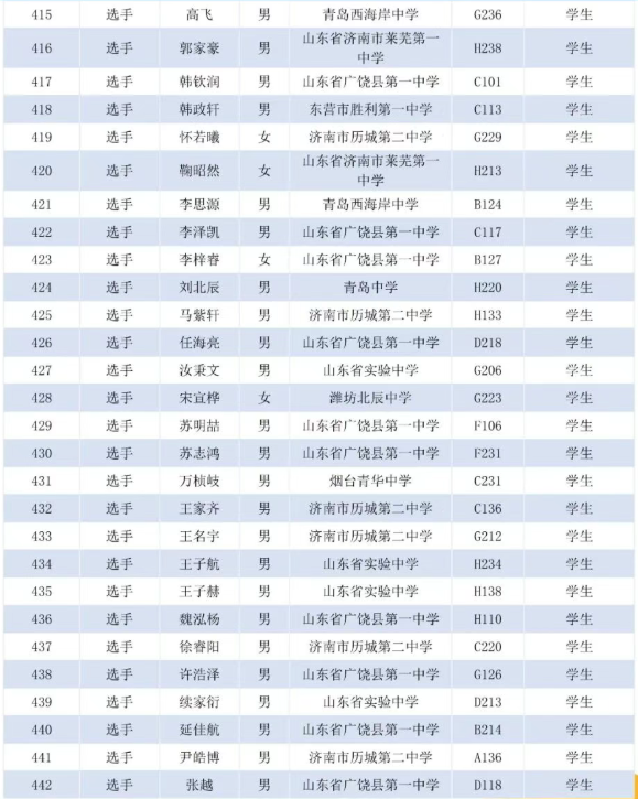 第39届中国化学奥林匹克(决赛)山东赛区省队名单