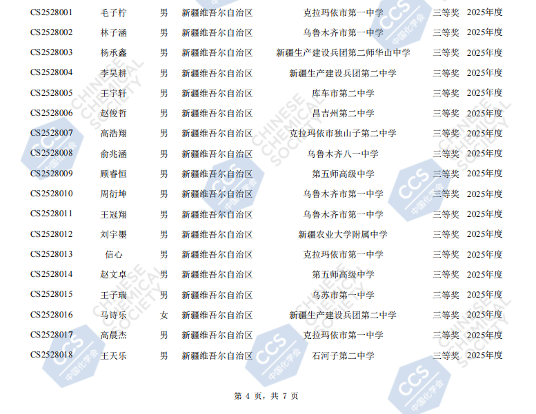 新疆2025年全国中学生化学竞赛初赛省三获奖名单
