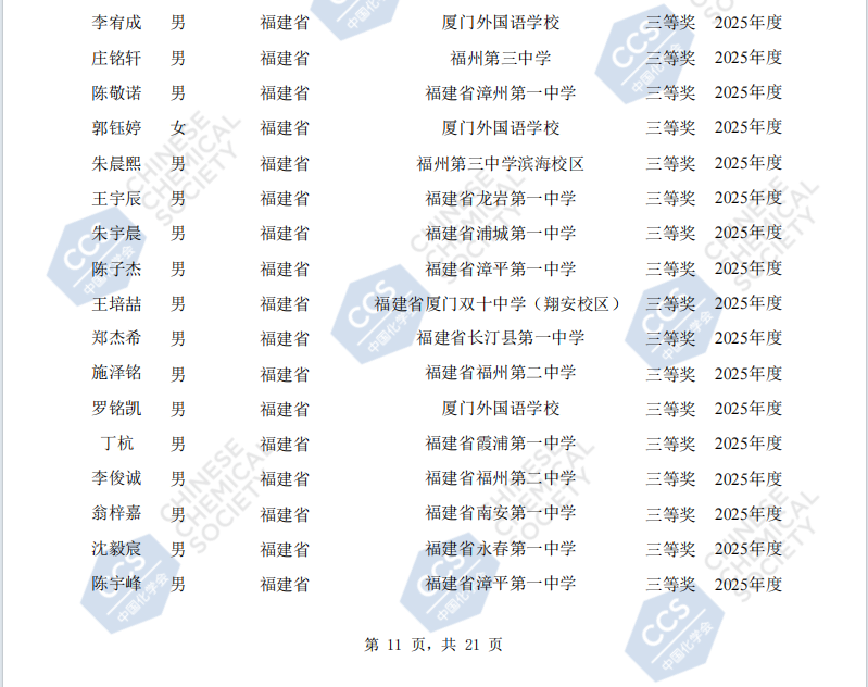 福建省2025年全国中学生化学竞赛初赛三等奖获奖名单由中国化学会于2025年9月30日发布,目前,这份名单正在公示期内。相关信息如下: