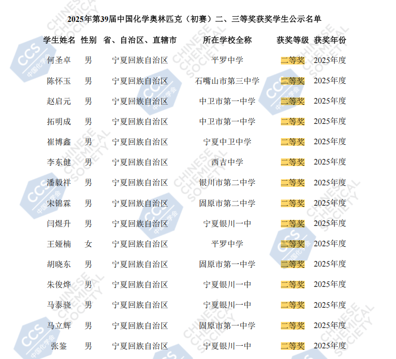 宁夏2025年第39届全国中学生化学竞赛初赛省二获奖名单