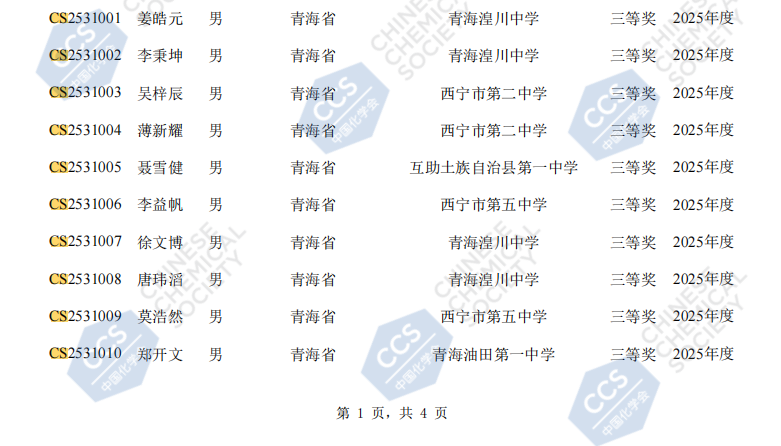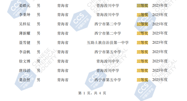 青海省2025年第39届全国中学生化学竞赛初赛省三获奖名单
