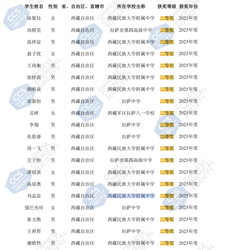 西藏2025年第39届全国中学生化学竞赛初赛省二获奖名单