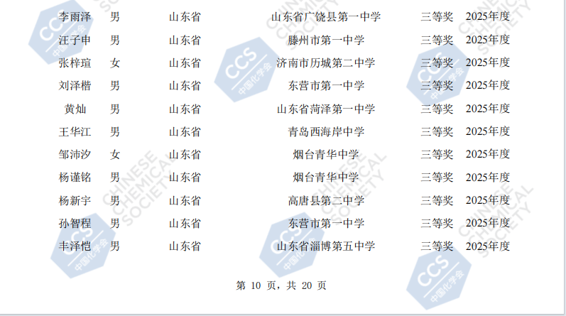 山东省2025年全国中学生化学竞赛初赛三等奖获奖名单