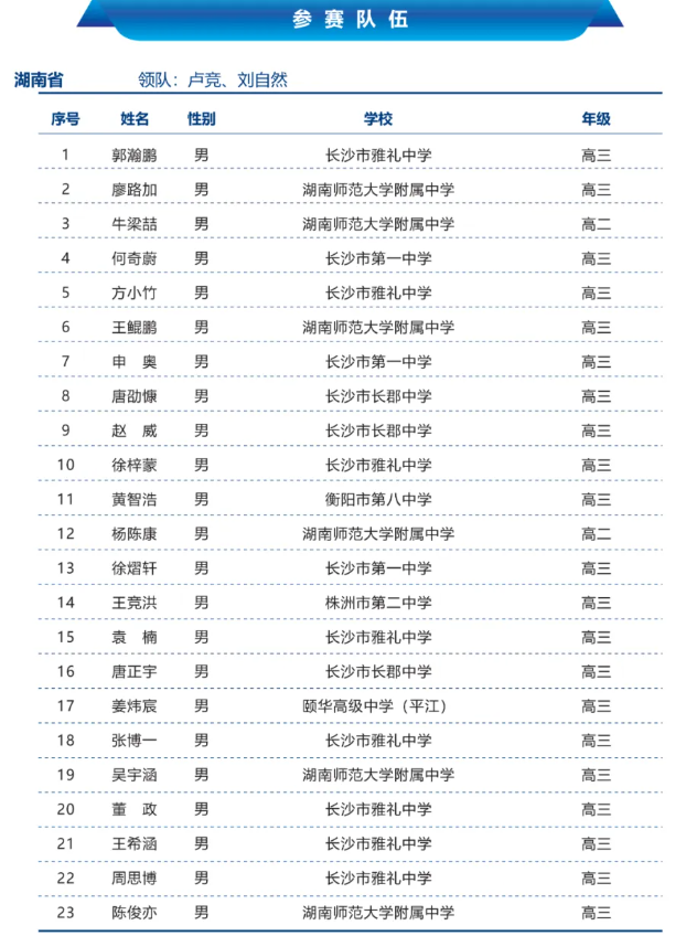 湖南省2025年中学生物理竞赛复赛省队名单