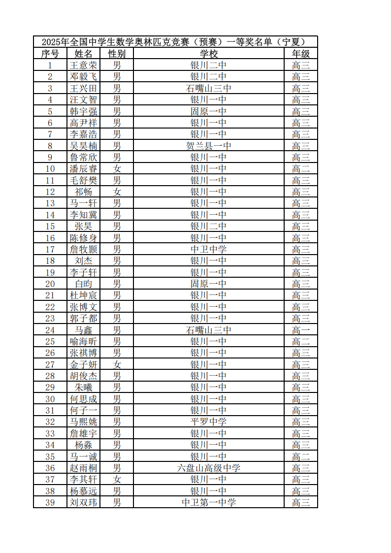 宁夏2025年第41届全国高中数学竞赛联赛省一获奖名单