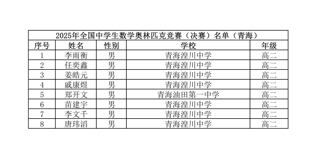 青海省2025年第41届全国高中数学竞赛联赛省队获奖名单
