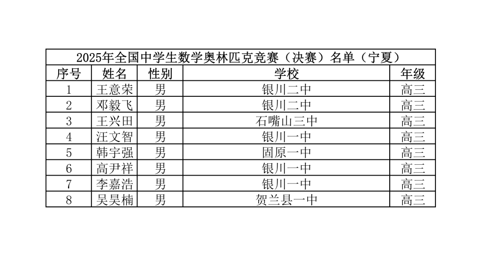 宁夏2025年第41届全国高中数学竞赛联赛省队获奖名单