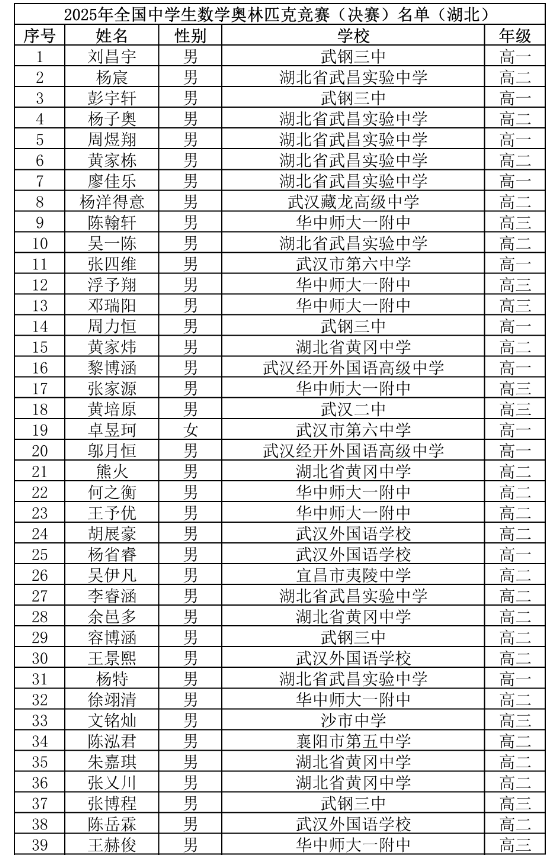 2025年全国中学生数学联赛湖北赛区省队名单现已揭晓,共计有51人上榜!接下来为大家带来湖北省数学联赛省队获奖名单相关内容,一起来看!