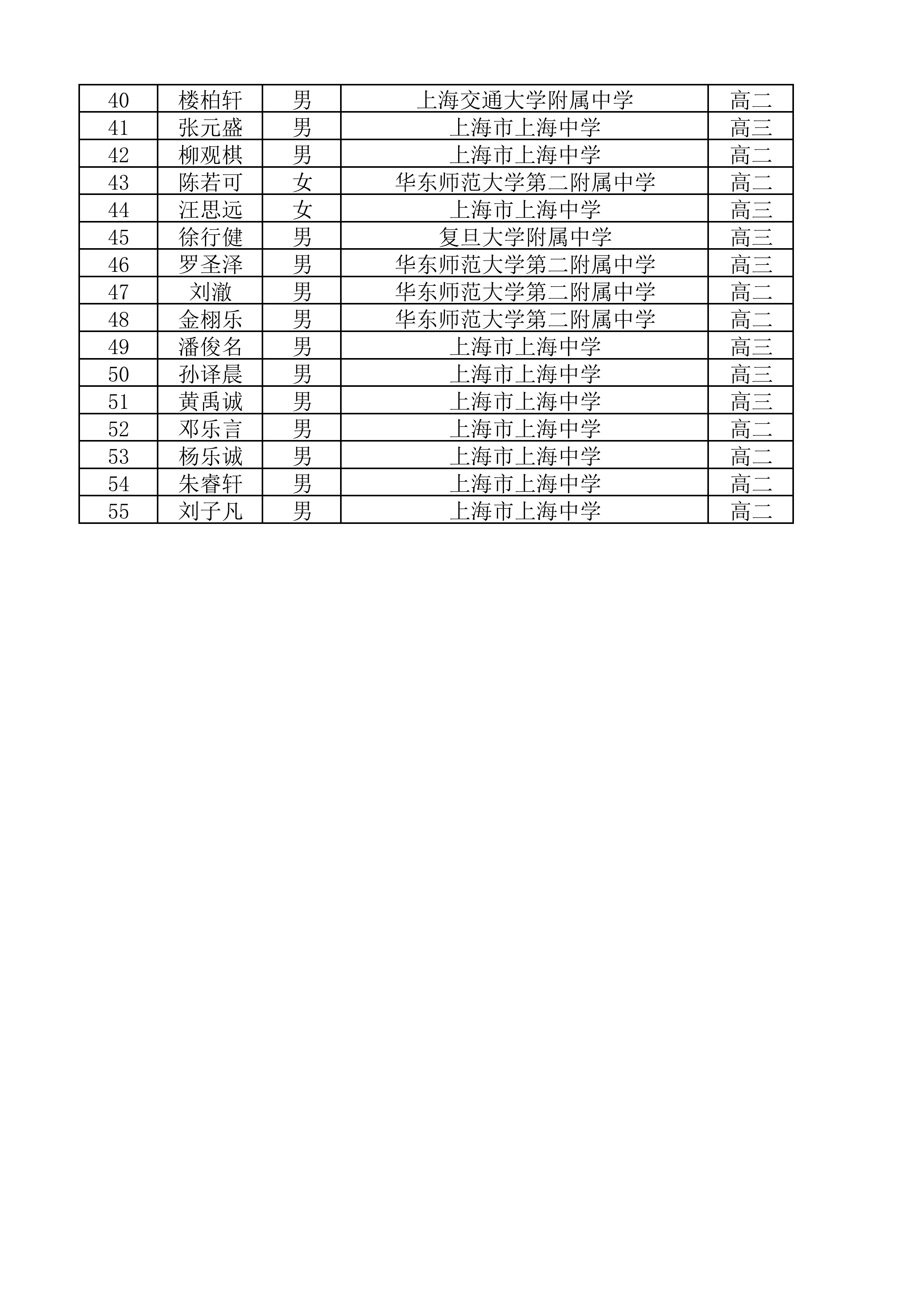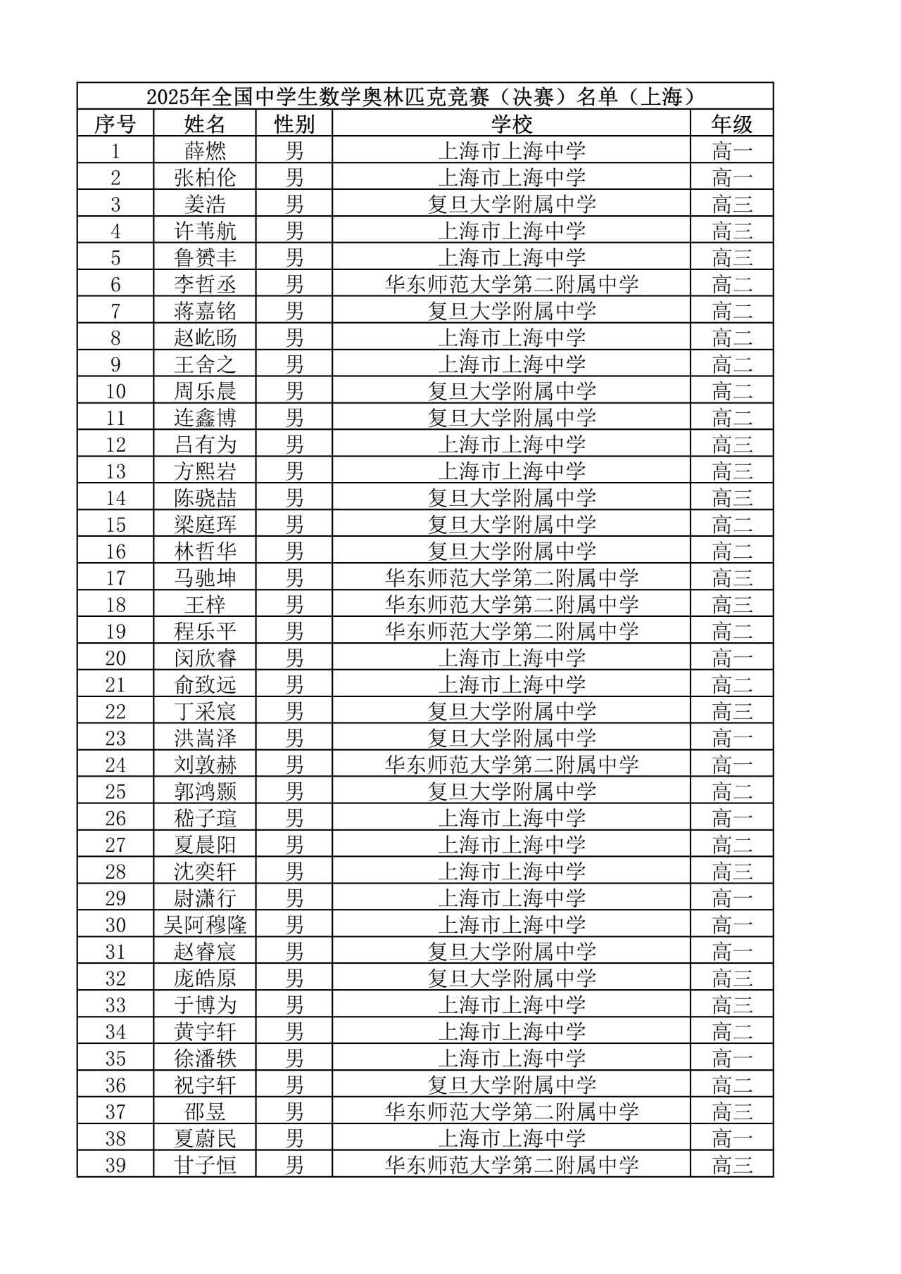 上海市2025年第41届全国高中数学竞赛联赛省队获奖名单