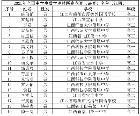 江西省2025年数学联赛省队获奖名单正式揭晓,共计19人成功入选省队。祝贺这些获奖的同学,接下来自主选拔在线团队为大家带来江西省数学联赛省队获奖名单相关内容,一起来看!