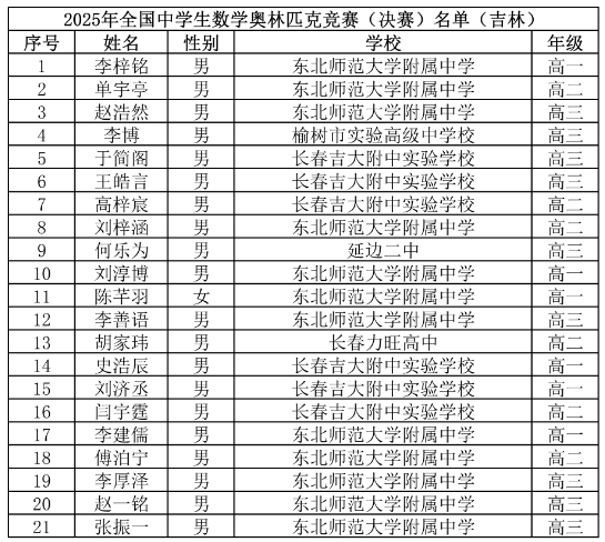 吉林省2025年数学联赛省队获奖名单揭晓,此次共有21名同学成功入选省队,恭喜入选的同学们,接下来为大家带来吉林省数学联赛省队获奖名单的相关内容,各位竞赛生一起来看!
