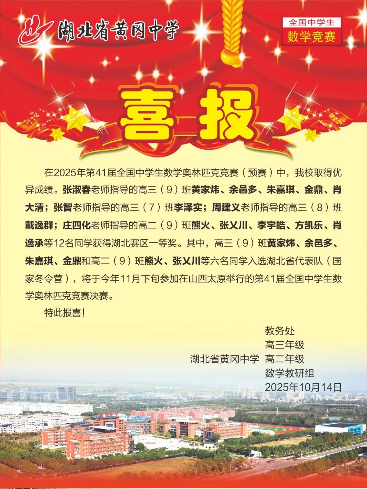 近日,2025年第41届全国中学生数学奥林匹克竞赛(预赛)成绩公布,我校学子再创辉煌,共有12名同学荣获湖北赛区一等奖,其中6名同学成功入选湖北省代表队,即将代表湖北省征战全国决赛!