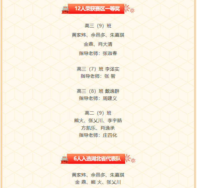 特别值得一提的是,黄家炜、余邑多、朱嘉琪、王鼎、熊火、张乂川六位同学成功入选湖北省代表队,他们将于今年11月下旬赴山西太原,参加第41届全国中学生数学奥林匹克竞赛决赛。我们期待他们再创佳绩,为校争光!