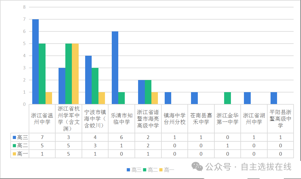 第一梯队:温州中学与杭州学军中学,双雄并立,虽然都是13位省队,但是学军的后续潜力更强一些,温州中学的高三占比过高,高一突出重围的又只有1人;而反观学军,高三只有3人,组成省队的人员非常年轻化,特别是高一有5人,可以为杭州学军保证3年的战斗力。