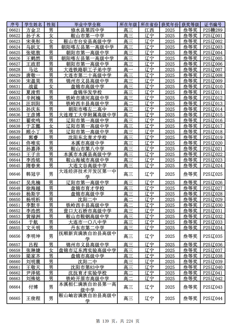 辽宁省2025年中学生物理竞赛复赛省三获奖名单